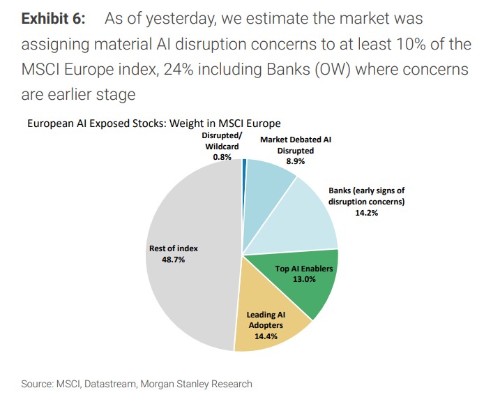 目前,摩根士丹利估計約 10% 的 MSCI 歐洲指數權重(不含銀行)被市場認為面臨實質性 AI 顛覆擔憂,如果包含銀行則達到 24%。銀行板塊的擔憂相對較新,主要集中在更廣泛的經濟通縮和就業問題,以及(程度較輕的)與 AI 相關的存款競爭擔憂。