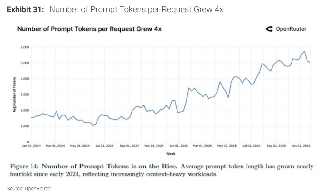 - OpenRouter 數據顯示,從 2024 年 11 月底到 2025 年 11 月底,每週平均 token 需求增長超過 2200%。Token 使用是算力需求的直接代理指標。