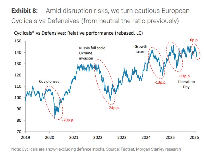 摩根士丹利已將立場從中性轉向謹慎看待週期股相對防禦股,並指出歐洲信貸市場提供了便宜的下行對沖機會,重點關注公用事業、半導體、國防和煙草等被視為最具韌性的避風港。