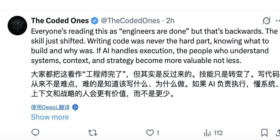 Altman emphasized that the core of this transition lies in AI taking on all aspects of code writing, infrastructure management, and daily decision-making. As OpenAI's products move towards 100% AI-written code, traditional engineering teams are no longer the ones being enhanced but are facing the risk of being "deprecated." This also marks a shift in the constraints of technology development from "engineering capacity" to "strategic clarity."