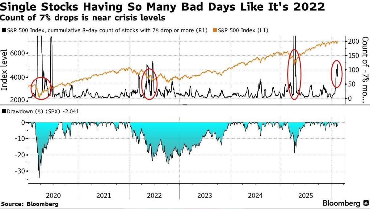 This month, the number of S&P 500 constituent stocks that have fallen 7% or more within eight trading days has exceeded 100, approaching the levels seen during the 2022 U.S. stock market bear market.