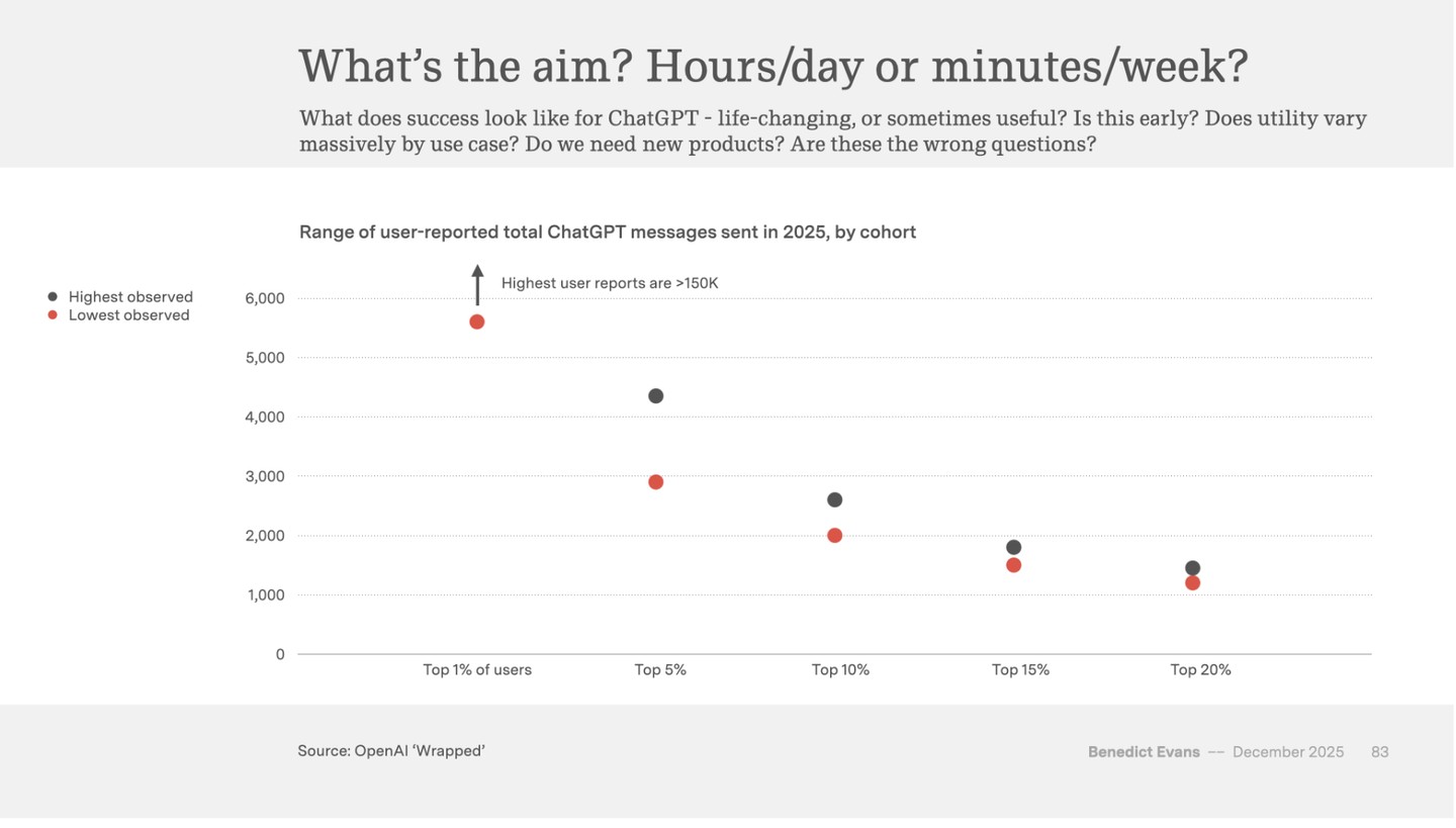 数据显示,只有 5% 的 ChatGPT 用户付费,即使是美国青少年,每周使用几次或更少的比例也远高于每天多次使用的比例。OpenAI 在"2025 年度总结"活动中披露,80% 的用户在 2025 年发送的消息少于 1000 条,按面值计算相当于平均每天不到三次提示,实际聊天次数更少。