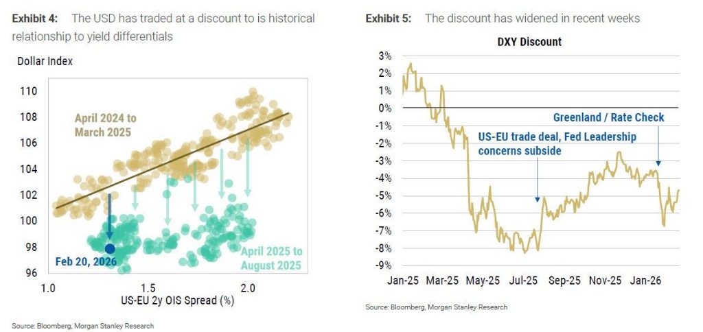 In the dollar market, Morgan Stanley expects that the U.S. government's use of immediate tariff authority as a tool of foreign policy will have less room, which may marginally reduce the negative risk premium associated with investors being cautious about holding dollar exposure.