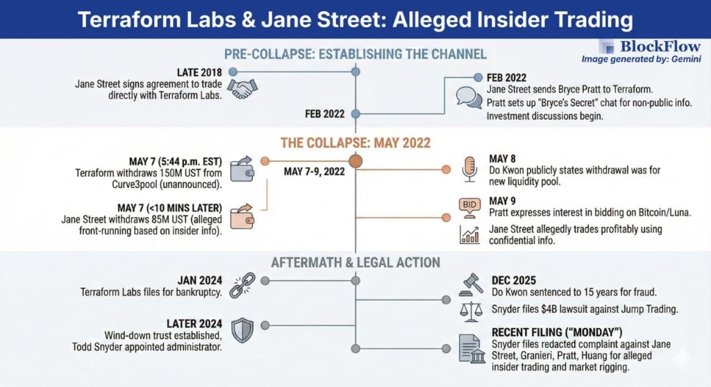 Jane Street is accused of acting as a "behind-the-scenes manipulator" in the $40 billion collapse of Terra: obtaining insider information through a secret channel called "Bryce's Secret," completing the largest single sell-off in history less than 10 minutes after Terraform quietly withdrew its investment, and then attempting to bottom out at a steep discount. This institutional-level short selling ultimately triggered a global crypto winter, leading to the dramatic collapse of FTX