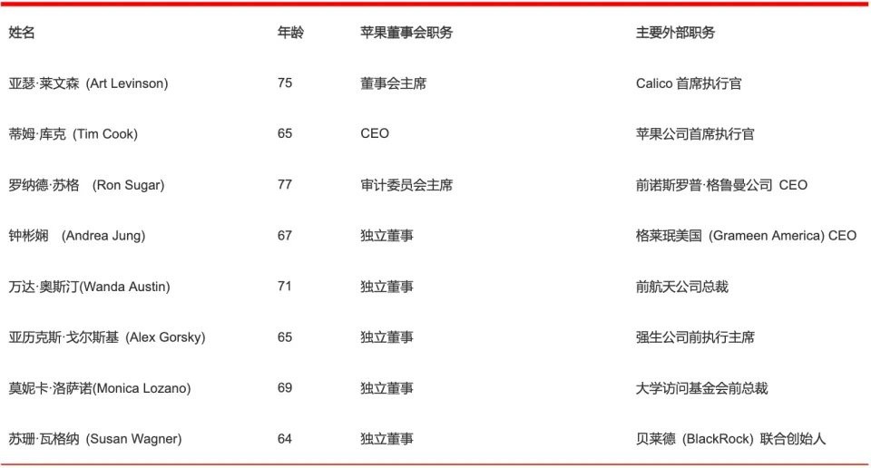 从结构上看,苹果董事会延续了以资深成员为主的构成特征,多数董事拥有跨国企业或大型机构的管理经验,涵盖科技、消费品牌、生物医药、国防航天及金融投资等领域。独立董事占多数,维持了董事会在公司治理与监督层面的独立性安排。