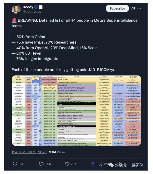 In July last year, Silicon Valley VC mogul Deedy obtained a list of personnel from Meta's super team from an anonymous Meta employee. Among the 44 people, nearly 40% came from OpenAI. OpenAI has been hit the hardest in terms of talent poaching.