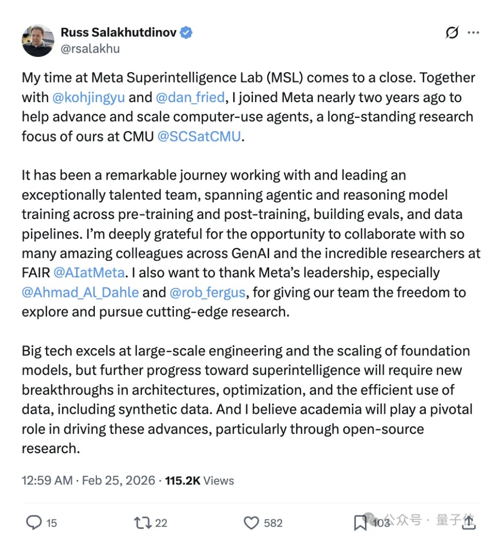 Geoffrey Hinton's core disciple, Meta's Vice President of Generative AI Research, Carnegie Mellon University Computer Science Professor, and Apple's first AI Director Russ Salakhutdinov has also officially announced his departure yesterday after two years at Meta.