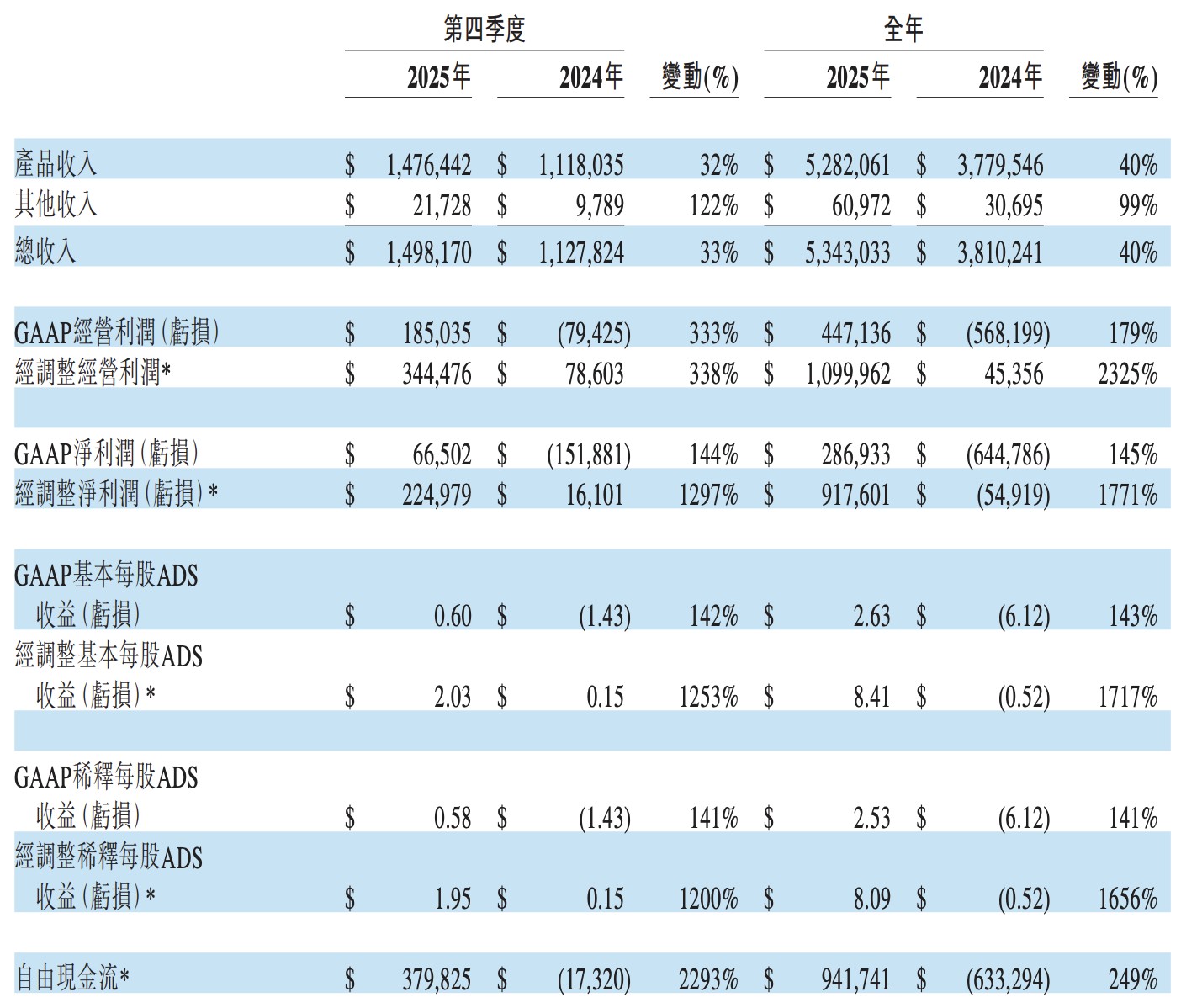 Profit quality has significantly improved, with non-GAAP operating profit reaching $1.1 billion for the year, soaring over 23 times compared to $45.36 million in 2024. Free cash flow turned positive for the year at $942 million, a qualitative leap from a negative $633 million in 2024, and the full release of operating leverage marks the company's commercialization entering a new phase.