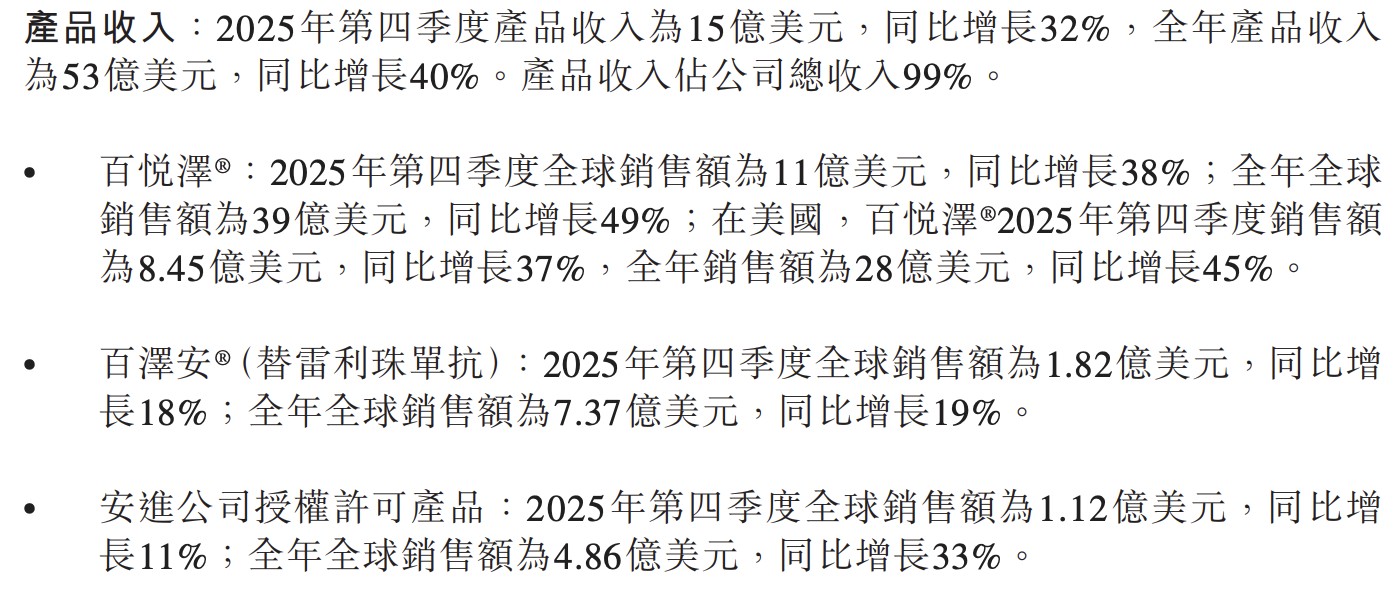 The flagship product Brukinsa (Zebutinib) continues to expand rapidly, with global sales for the year reaching $3.9 billion, a year-on-year increase of 49%; fourth quarter sales exceeded $1.1 billion, a year-on-year increase of 38%. The U.S. market contributed $2.8 billion for the year, a year-on-year increase of 45%, maintaining its position as the global leader in the BTK inhibitor market.
