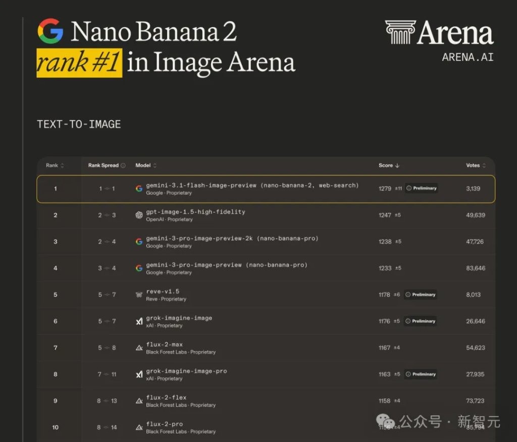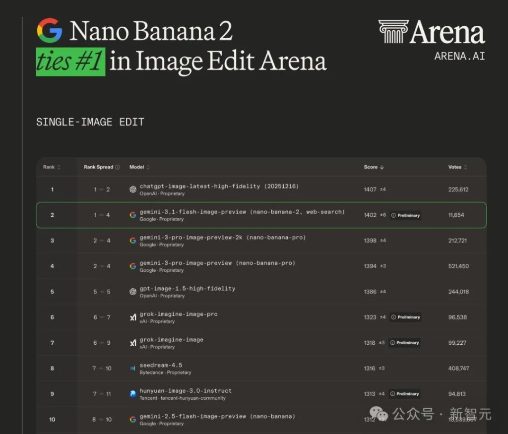在 Image Arena 中,NB2 文生图同样问鼎榜首,斩获 1279 Elo 得分,图像编辑实力仅次于 GPT Image。