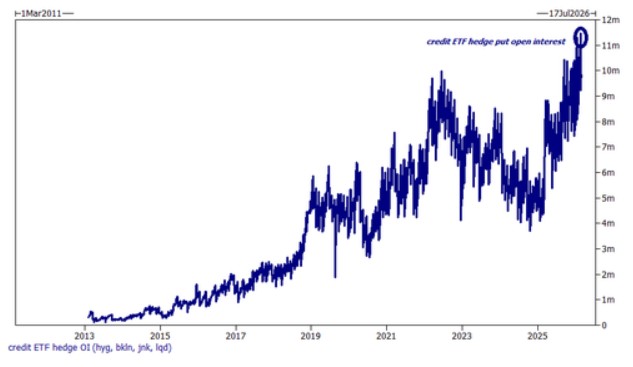 Goldman Sachs trader Garrett pointed out that among all the panic signals, the "retreat" in credit is the most concerning. The panic sentiment, which was previously limited to long and short books, has gradually permeated to the index level and ultimately transmitted to the credit market. The CDX investment-grade credit spread widened by 5 basis points in a single week, marking the largest weekly increase since last summer, and the open contracts for credit ETF hedging positions have risen to historical highs