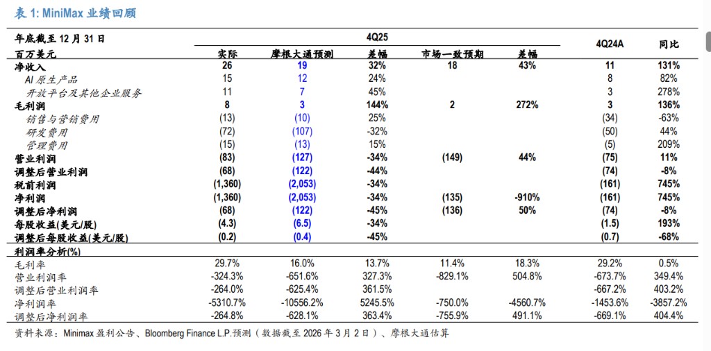 MiniMax 在 2025 年第四季度实现了 2600 万美元的净收入,同比增长高达 131%。这一数字不仅超出了摩根大通预测的 1900 万美元(高出 32%),也高于彭博一致预期的 1800 万美元(高出 43%)。