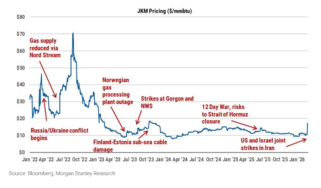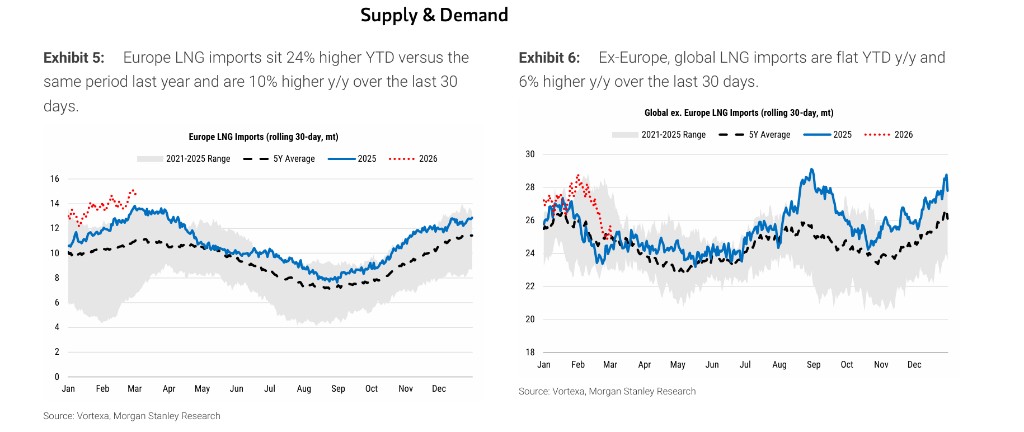 - 基准情景(快速平息):摩根士丹利认为此次中断短暂。随着局势缓和,JKM 将回落至 10 至 11 美元/百万英热单位,并在未来数月进一步跌回 10 美元以下,与该行此前预测一致。当前基本面偏宽松——冬季需求高峰已过,3 月天气预报温和,Golden Pass 首批 LNG 亦即将投产。