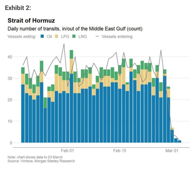 霍尔木兹海峡的石油通道正濒临瘫痪。据摩根士丹利最新追踪数据,3 月 3 日当天仅有 1 艘油轮通过这一全球最重要的能源咽喉,较正常水平骤降逾 95%,伊拉克已被迫削减产量,亚洲炼油商开始压缩加工负荷,全球能源市场正承受这场罕见中断带来的剧烈冲击。