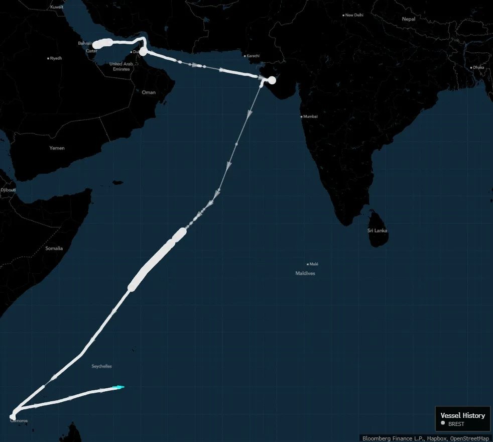据彭博社汇编的船舶追踪数据,近日已有五艘满载柴油和航空燃油的油轮中途掉头,从原定西行航线转向东亚。其中三艘油轮来自印度,另外两艘在上周霍尔木兹海峡实际关闭前已驶出波斯湾。