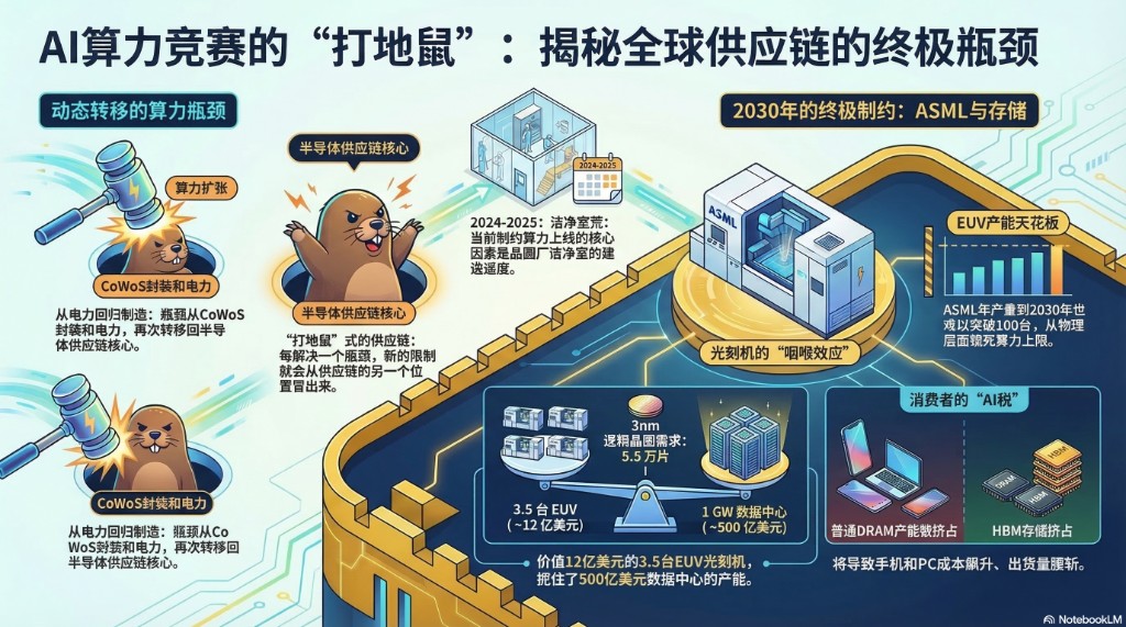 The founder of SemiAnalysis stated that the bottleneck of AI computing power expansion is like "whack-a-mole" and is constantly changing. Currently, the bottleneck may return to chip manufacturing. The demand for high-bandwidth memory (HBM) triggered by inference models has a wafer consumption four times that of ordinary DRAM, which will lead to a halving of smartphone shipments. By 2026, 30% of the capital expenditure of tech giants will be consumed by storage. Power is not the ultimate constraint, as solutions such as aircraft modifications and fuel cells can be addressed through "post-meter" options. The ultimate ceiling may be after 2028, due to ASML's annual production of fewer than 100 EUV lithography machines