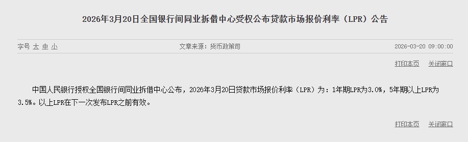 China's LPR in March remains unchanged for the tenth consecutive month: the LPR for over 5 years is 3.5%, and the 1-year LPR is 3%