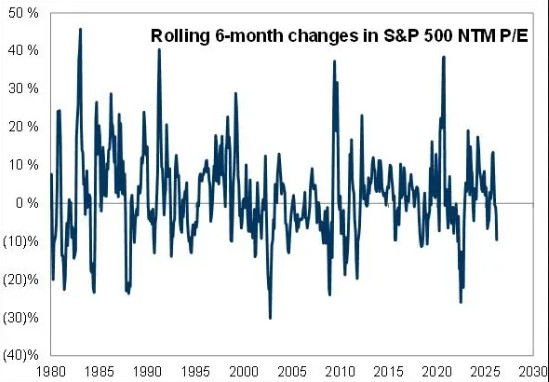 Tuteja 指出,在盈利预期上调的背景下,指数六个月原地踏步,本质上意味着估值倍数正在收缩。尽管美股年初估值按历史标准仍属偏贵,但过去六个月 NTM 市盈率的压缩幅度,在过去 45 年的历史数据中已属显著。
