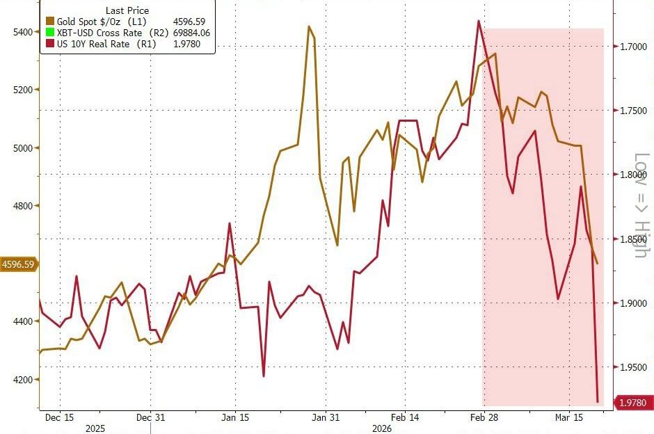 分析人士将本轮金价下跌部分归因于美元融资压力显现。跨货币基差掉期本周明显扩大,暗示市场存在美元流动性紧张迹象;黄金亦重新与实际利率呈现负相关——随着实际利率快速攀升,黄金承压下行。