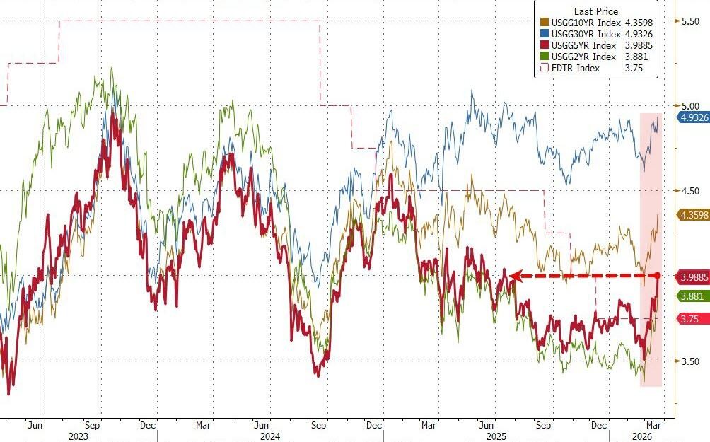 美债 10 年期收益率单日飙升 13.4 个基点,本周累计上涨逾 10 个基点;5 年期收益率自 7 月以来首次突破 4%,收益率曲线急剧平坦化。