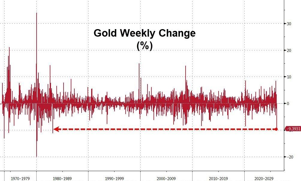 黄金的溃败尤为触目惊心。现货黄金本周累计下跌逾 10%,COMEX 黄金期货周跌幅超过 11%,创下自 1983 年 3 月以来最大单周跌幅。