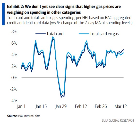 Although the Federal Reserve has clearly stated that its policy objective is anchored to employment rather than GDP, resilient consumer demand will provide greater room for rate hikes. Bank of America's internal aggregation of credit and debit card data shows that consumer spending, excluding oil and gas, continues to grow strongly, indicating that consumers' wallets have not been significantly strained by rising oil prices.