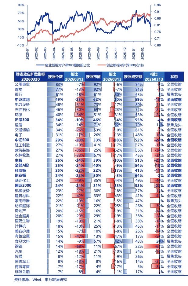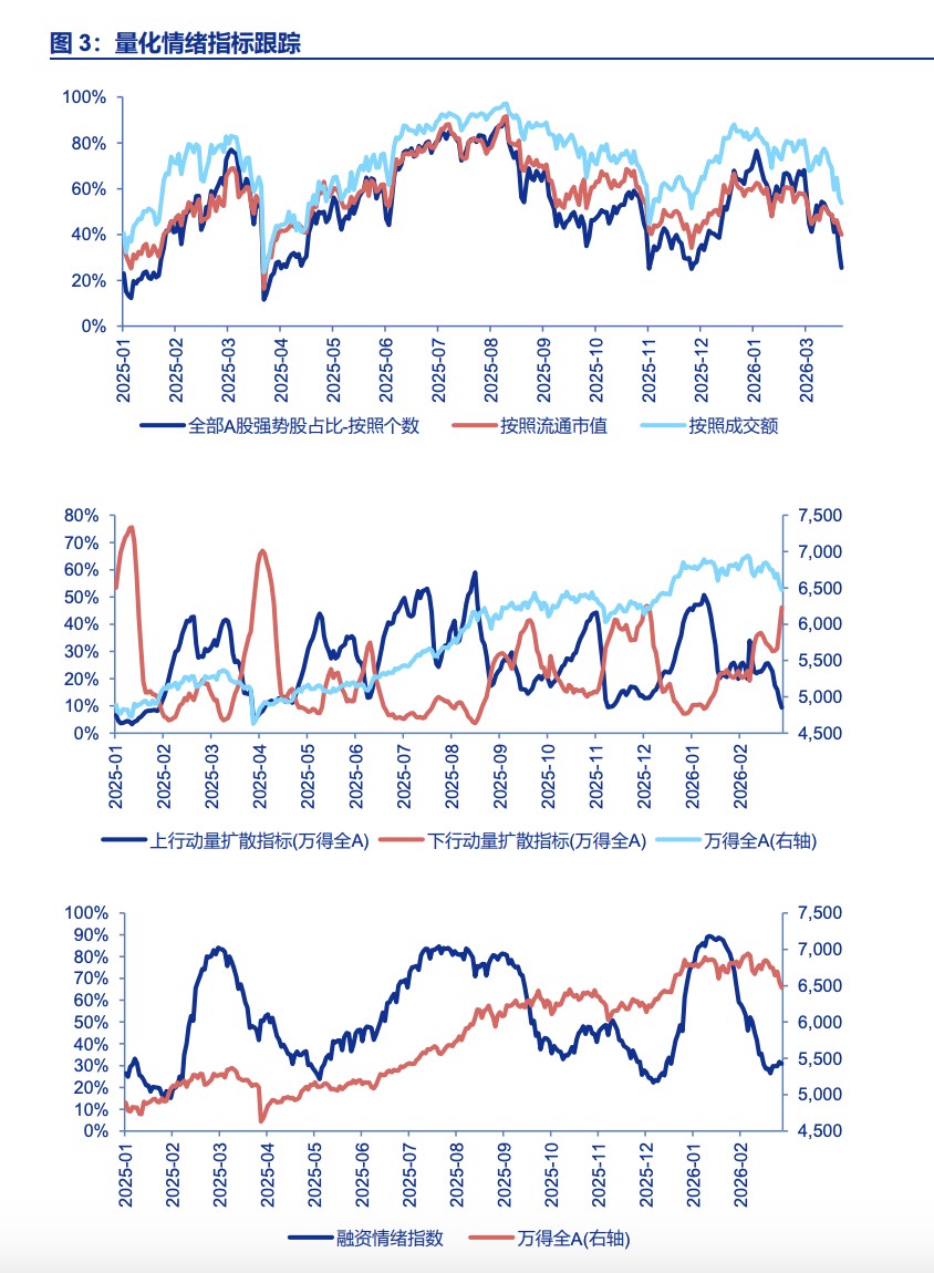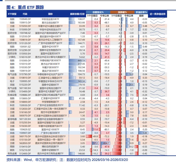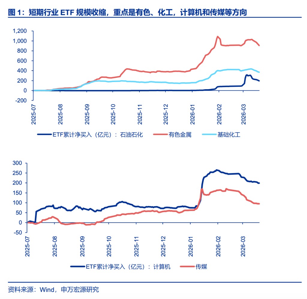 - The US-Iran conflict has reached a stalemate, and all parties are inadequately prepared for a new Middle Eastern order. However, the formation of a new equilibrium will still require a long period of strategic maneuvering. This is reflected in the ongoing short-term event-driven disturbances, which directly pressure capital market risk appetite. Short-term market projections of the US-Iran conflict's impact primarily draw parallels from the experiences of the two oil crises: rising oil prices and shipping costs → rising inflation → monetary tightening → economic recession, confirming a stagflationary cycle → synchronized decline in stock fundamentals and valuations. This logic chain cannot be falsified in the short term. Simultaneously, we note a short-term concentrated withdrawal of funds that supported the "first phase of the rally": 1. Shrinking industry ETF sizes, particularly in the non-ferrous, chemical, computer, and media sectors.