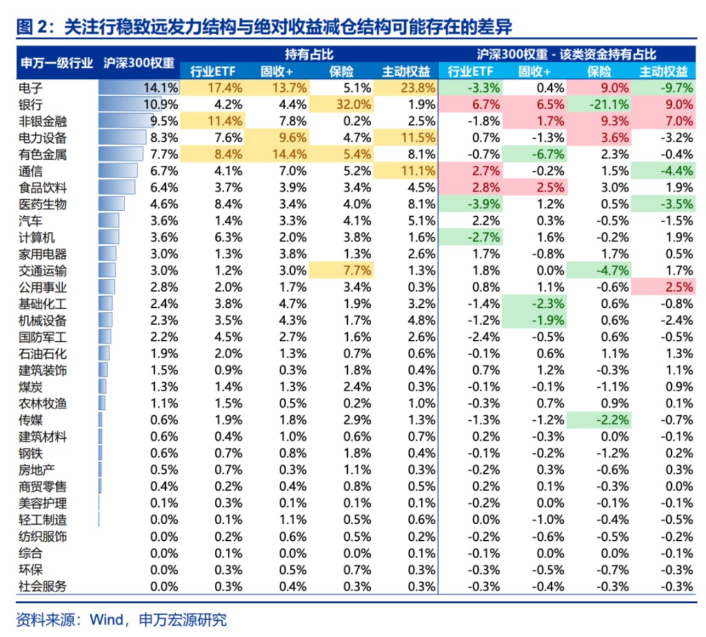 - Absolute return funds are seeing their floating profits rapidly shrink, forcing them to reduce equity positions to avoid principal losses. Annuities, which had significantly increased their equity exposure earlier, are seeing the stability of their high positions decline in the short term. Referencing the holding structures of active public funds and "Fixed Income+" products, sectors such as non-ferrous, chemicals, communications, and electronics may all face pressure for position reductions. Allocation-based funds increased equity exposure in this round, with "Fixed Income+" products being an important channel, and short-term redemption pressure is beginning to manifest. With the concentrated withdrawal of funds, the implementation of steady and sustained growth policies is logical. Attention should be paid to potential differences between the structure of steady and sustained growth efforts and the structure of absolute return fund reductions (CSI 300 weight - industry ETF weight, CSI 300 weight - "Fixed Income+" holding weight). Overall index risk is controllable, but structural shocks may still pose tail risks.