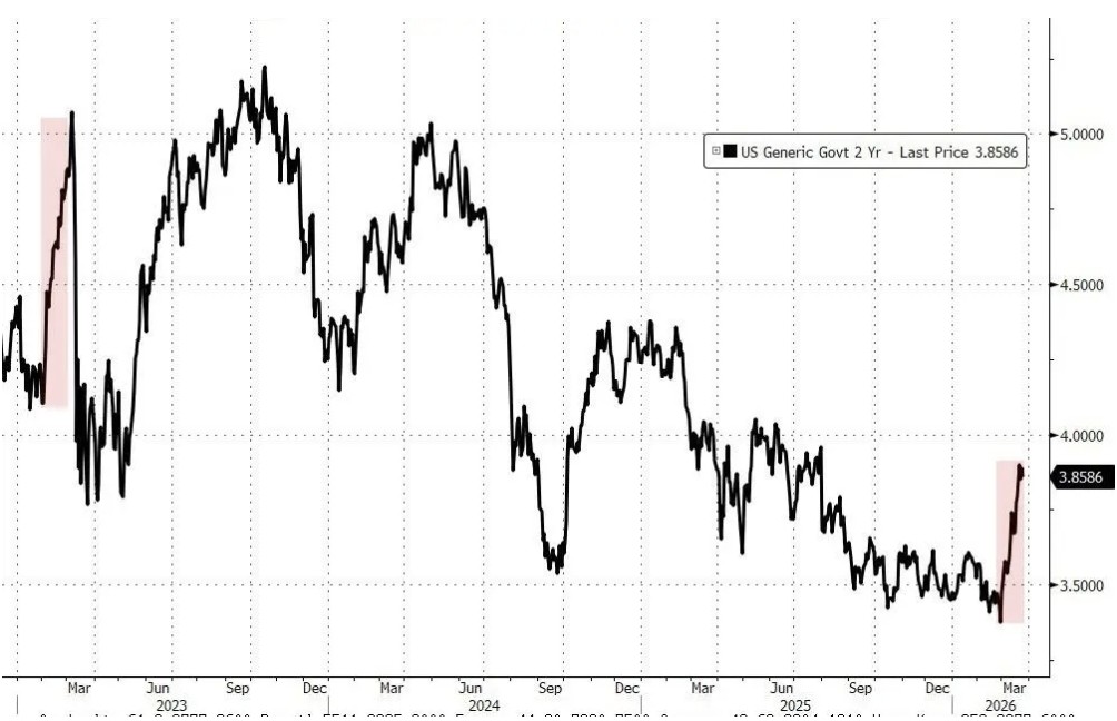 The yield on US 2-year Treasury notes has risen by approximately 50 basis points in about three weeks, marking the largest single-period increase since the Silicon Valley Bank crisis. Demand at the latest US Treasury auction was weak, with the bid-to-cover ratio hitting its lowest point since May 2024, and the tail hitting its widest point since March 2023.