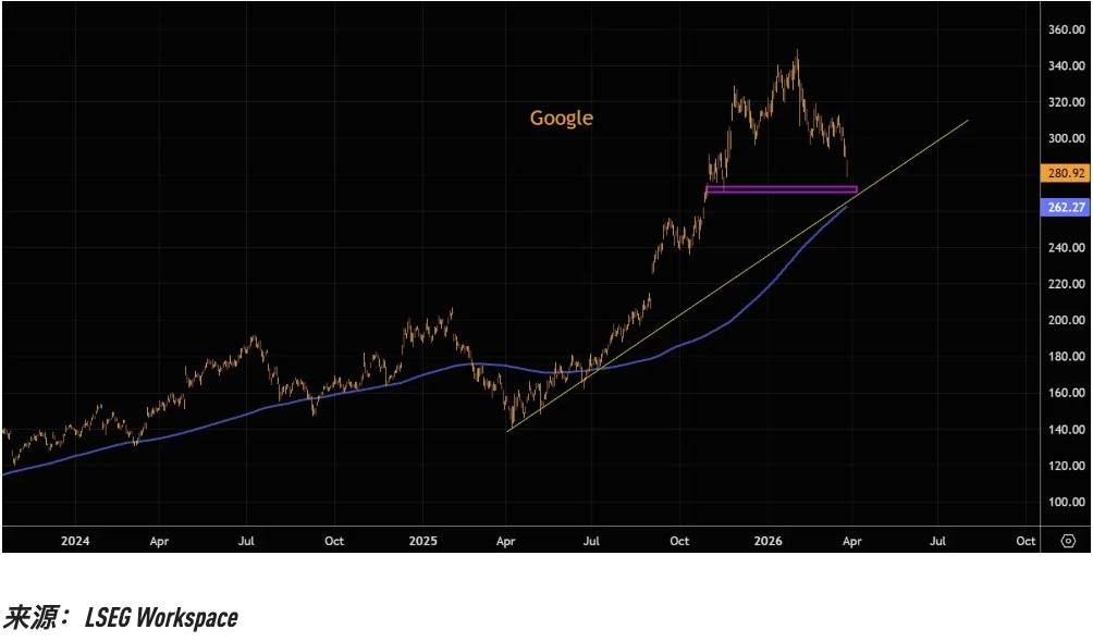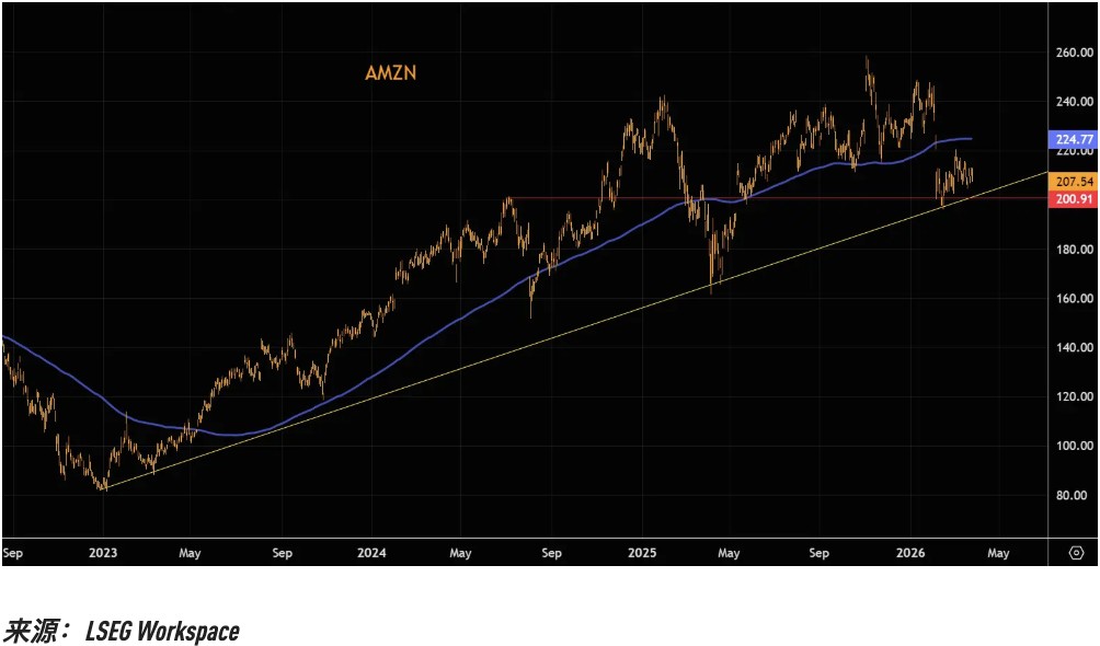 Among the seven components, Apple is currently the only stock showing relatively resilient performance, with the market classifying it as a beneficiary of the "anti-AI" narrative. The uptrend line extending from the "Liberation Day" low point intersects with the 200-day moving average at the current level, forming a key Support Level area that warrants close attention.