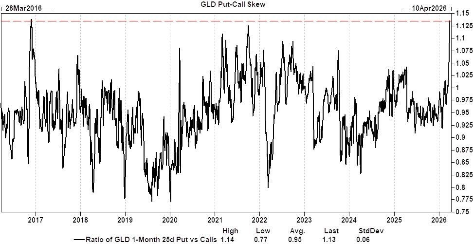Gold is down more than 17% from its highs, and current positioning has become much less crowded. Implied volatility on gold puts is now higher than calls (which is extremely rare for gold).