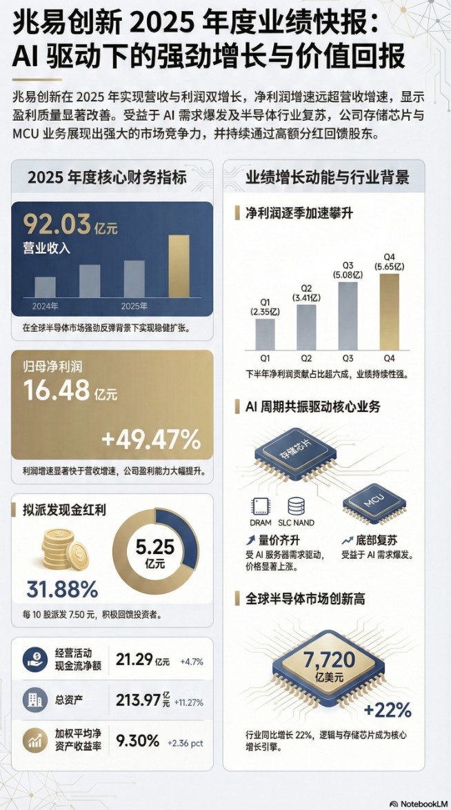 GigaDevice (GIGADEVICE) achieved an annual revenue of 9.203 billion yuan in 2025, a year-on-year increase of 25.12%; its net profit attributable to the parent company was 1.648 billion yuan, a year-on-year increase of 49.47%, with a significant improvement in profitability. Specialized memory is the main driver of the company's performance growth, with prices for niche DRAM and SLC NAND Flash soaring during the reporting period