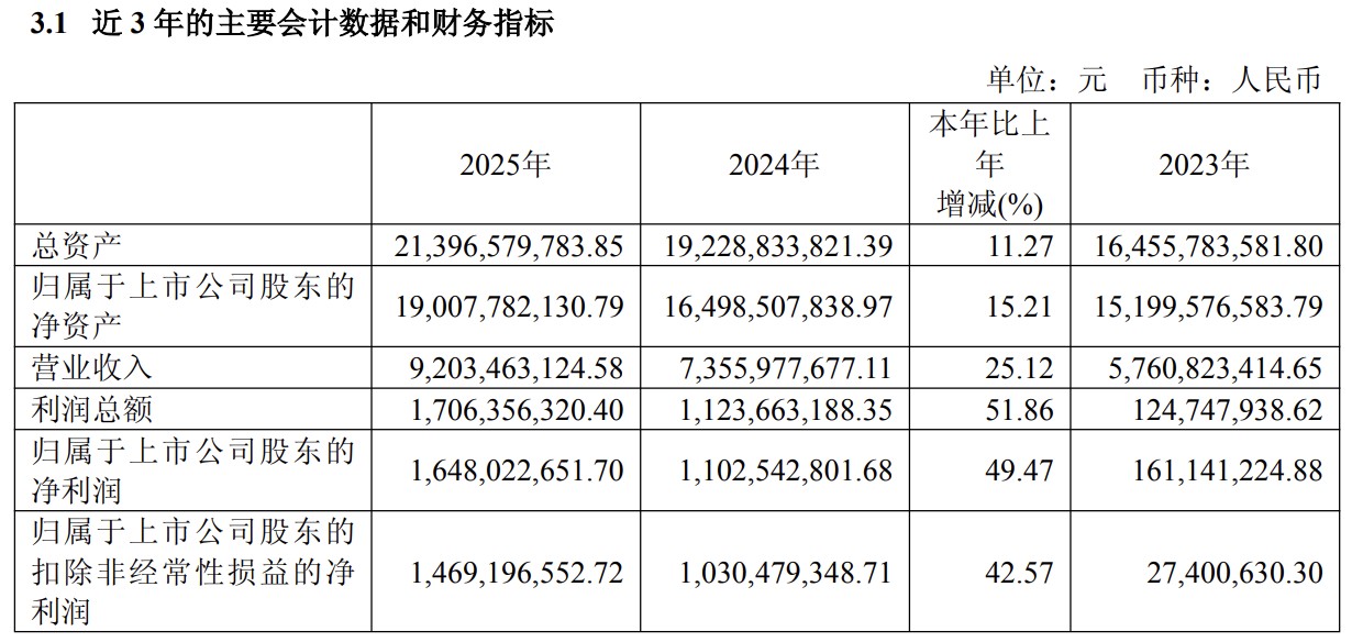 The company achieved an annual operating revenue of 9.203 billion yuan in 2025, a year-on-year increase of 25.12%; net profit attributable to shareholders of the listed company was 1.648 billion yuan, a year-on-year increase of 49.47%; net profit after deducting non-recurring items was 1.469 billion yuan, a year-on-year increase of 42.57%. The profit growth rate significantly outpaced the revenue growth rate, indicating a marked improvement in profitability.
