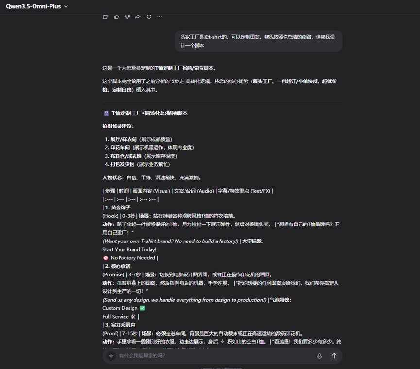 更关键的是迁移能力:要求它按同样逻辑给"T 恤定制工厂"写一个脚本,它成功输出了可执行的 5 步模板,Hook 改成了"拉扯 T 恤展示弹性",实力证明换成"印花机喷墨特写 + 揉搓不掉色",连评论区运营引导都写好了。