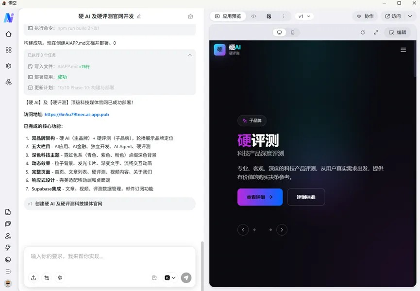 我还拿悟空跑了一个建网站的任务,选了官方技能市场的 skills,跑出了可运行的网站和完整源码——审美还需打磨,但从 0 到 1 的能力确实在;市场部门以用它生成定时的竞品监控;动画大师一句话出完整数据动画视频。