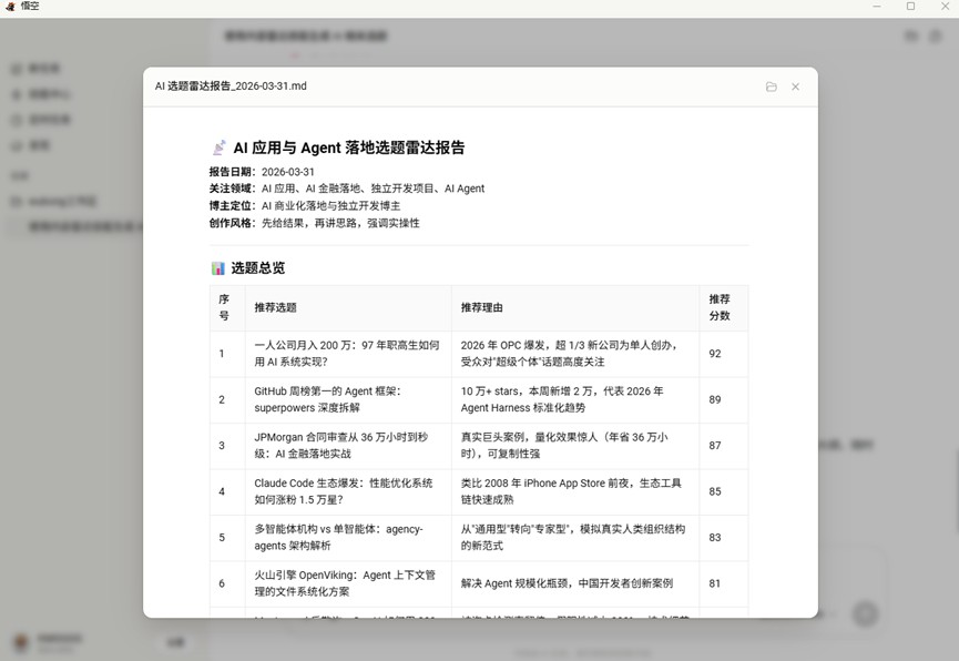 悟空调取了相关 Skill,自动创建了任务。第二天早 9 点过几分,手机弹出早报——排版整齐,链接可点。