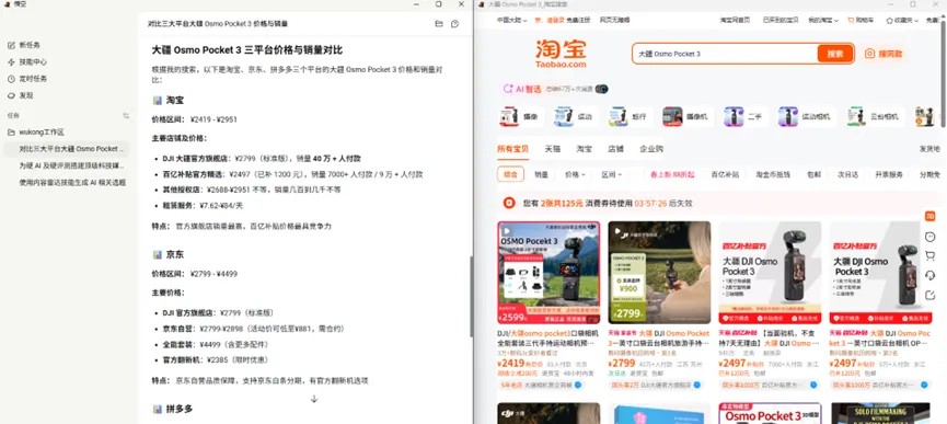 我让它在淘宝、京东、拼多多上搜"大疆 Osmo Pocket 3",比价格和销量,截图,整理成 Excel。