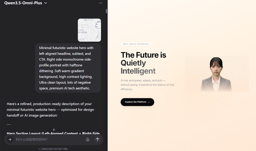 还有一个"口述写代码"的测试。手绘一张故意画得很粗糙的 APP 线框图,打开摄像头对着镜头口述需求,它直接生成了可运行的 React 代码。继续口述修改——侧边栏、圆角、深色主题、按压动画——多轮迭代下来上下文始终没丢。边看、边说、边改,这是人类最自然的交互方式,它接住了。