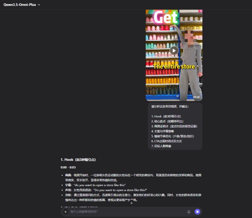 输入一条义乌招商类带货视频,模型按 Hook、卖点排序、画面证明点、字幕策略、情绪节奏、CTA 时间点、目标人群七个维度做了结构化拆解。核心洞察让我印象深刻——"这条视频卖的不是商品,而是确定性":三级物理证据链构建信任、"2 万种 SKU+20 美分均价"制造数字锚点、保姆式承诺实现风险逆转。