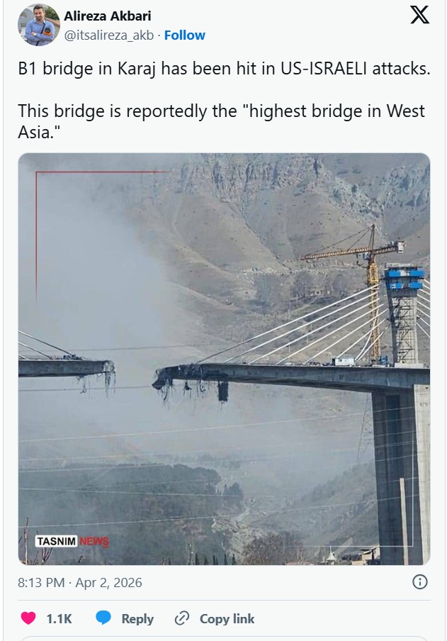 Subsequently, Iran's highest bridge—the bridge connecting Tehran and Karaj—was destroyed. According to reports cited by Xinhua News Agency, the target of the US-Israeli attack that day was the Beyke Road Bridge, a landmark project of Iranian engineering hailed as one of the world's most complex engineering achievements. It is a core piece of road infrastructure for the Tehran-Karaj transport corridor and was originally scheduled to officially enter operation soon.