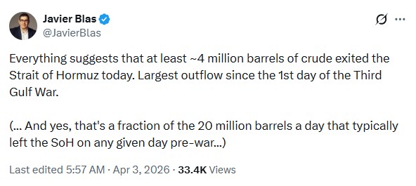Javier Blas, an energy and commodities journalist, posted on X: "All signs indicate that at least 4 million barrels of crude oil flowed out of the Strait of Hormuz today, marking the largest single-day outflow since the first day of the Third Gulf War."