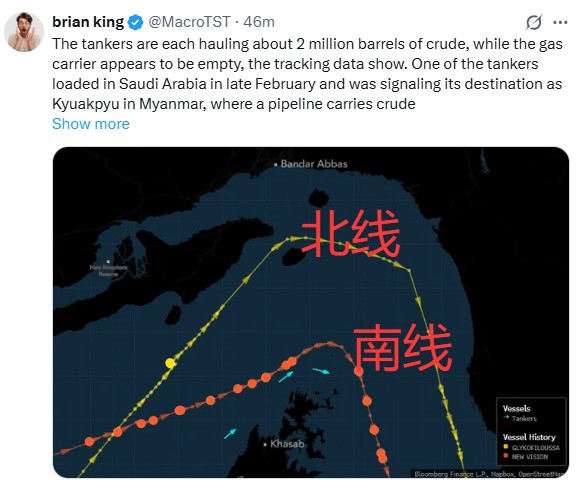 The two oil tankers each carry approximately 2 million barrels of crude. One loaded in Saudi Arabia in late February, with its destination listed as Kyaukphyu Port in Myanmar—a port connected to an oil pipeline leading to western China; the other loaded Abu Dhabi crude, with its destination undisclosed. Tracking data for the LNG carrier shows it is in ballast.