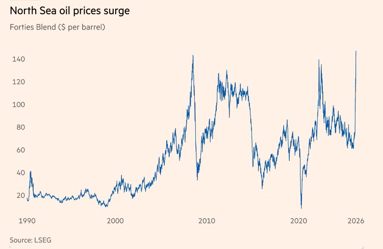 On Thursday, as European and Asian refiners scrambled to purchase North Sea spot crude, the North Sea spot oil price benchmark Forties Blend surged to nearly $147/barrel. According to LSEG data, this price has surpassed the historical high set on the eve of the 2008 financial crisis.