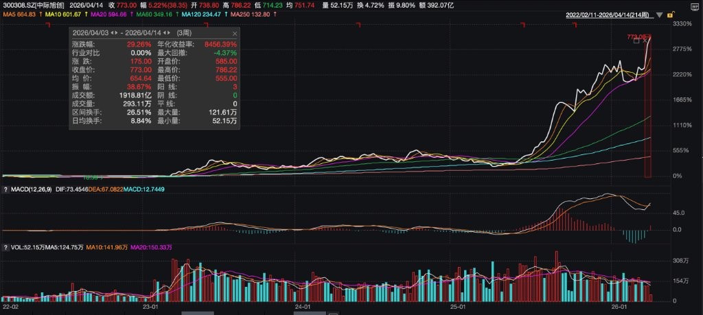 大立光电的战略选择,也与 CPO 赛道的市场热度形成呼应。Wind CPO 指数自 4 月 1 日以来累计涨幅超过 26%。国内 CPO 龙头中际旭创同期涨幅接近 30%,股价屡创新高,成为近期科技板块中最受关注的方向之一。