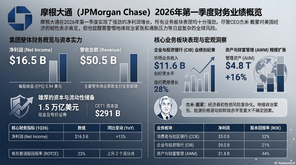 JPMorgan Chase delivered a robust report driven by twin engines of "Trading" and "Investment Banking." In the first quarter of 2026, the company's net profit surged to $16.5 billion, a 13% year-over-year increase; diluted earnings per share reached $5.94, marking a significant 17% rise. Reported and adjusted net revenues were $49.8 billion and $50.5 billion respectively, both achieving double-digit growth, with core metrics surpassing market expectations.