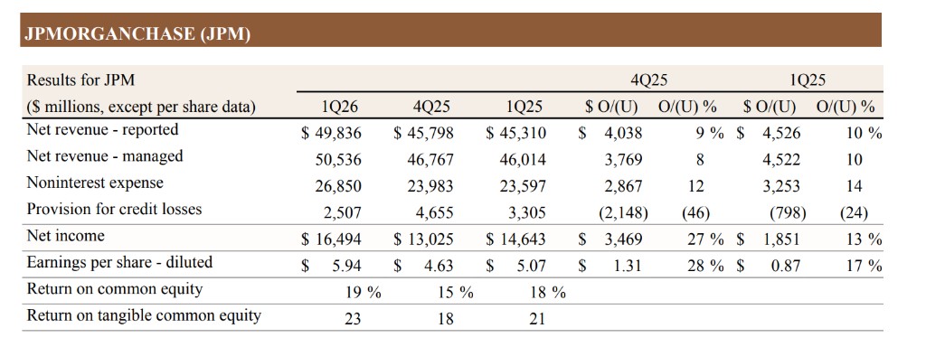 JPMorgan Chase reported a net profit of $16.5 billion for the first quarter of 2026, up 13% year-over-year, with earnings per share reaching $5.94, a 17% increase. Adjusted revenue was $50.5 billion, rising approximately 10%. Trading business revenue hit a quarterly record high at $11.6 billion, up 20% year-over-year, while investment banking income grew by 38%