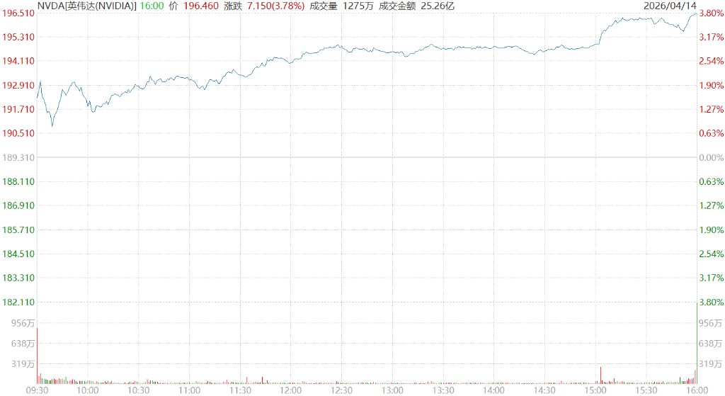 4 月 14 日周二,英伟达涨近 4%,连续 10 个交易日上涨,创下 2023 年 11 月 14 日以来最长连涨纪录,累计涨幅达 18.97%。