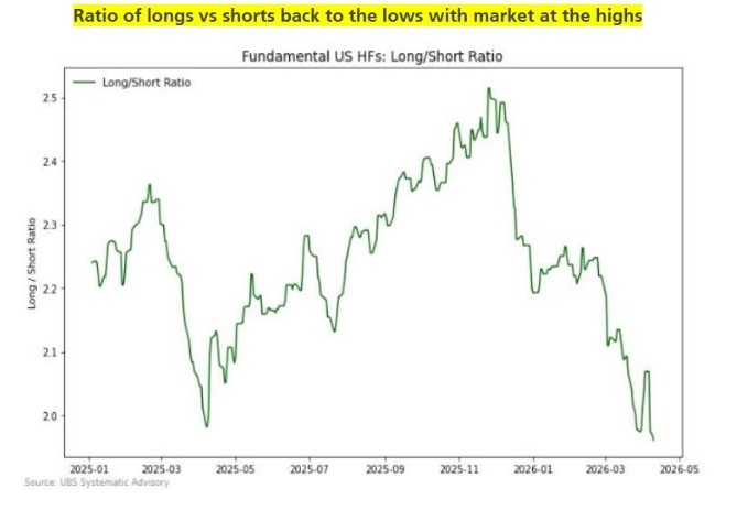 The S&P 500 recently broke through 7,000 points to set a new all-time high, with core thematic sectors such as AI, semiconductors, and technology hardware generally recovering to and surpassing pre-conflict levels. However, according to Conor Lyons, a trader at UBS, in his latest report, although performance data suggests hedge funds participated in this repricing, overall position data shows that net exposure did not keep pace.