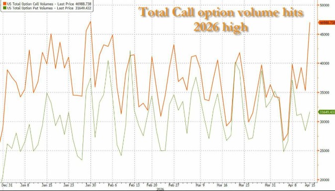 This mismatch is forcing hedge funds to chase the rally almost blindly, directly driving recent abnormal activity in the options market—yesterday (April 15) recorded the largest single-day call option volume since 2026.