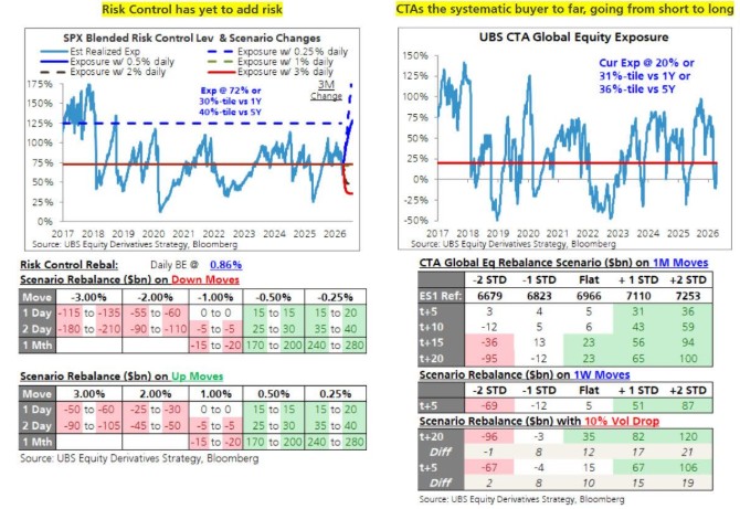 Risk Control strategies have not yet become effective buyers, constrained by recently elevated realized volatility, with their exposure remaining roughly flat quarter-over-quarter. However, UBS estimates that if the S&P 500 stabilizes in the future and daily volatility narrows to within plus or minus 50 basis points, Risk Control strategies could purchase approximately $185 billion over the next month.